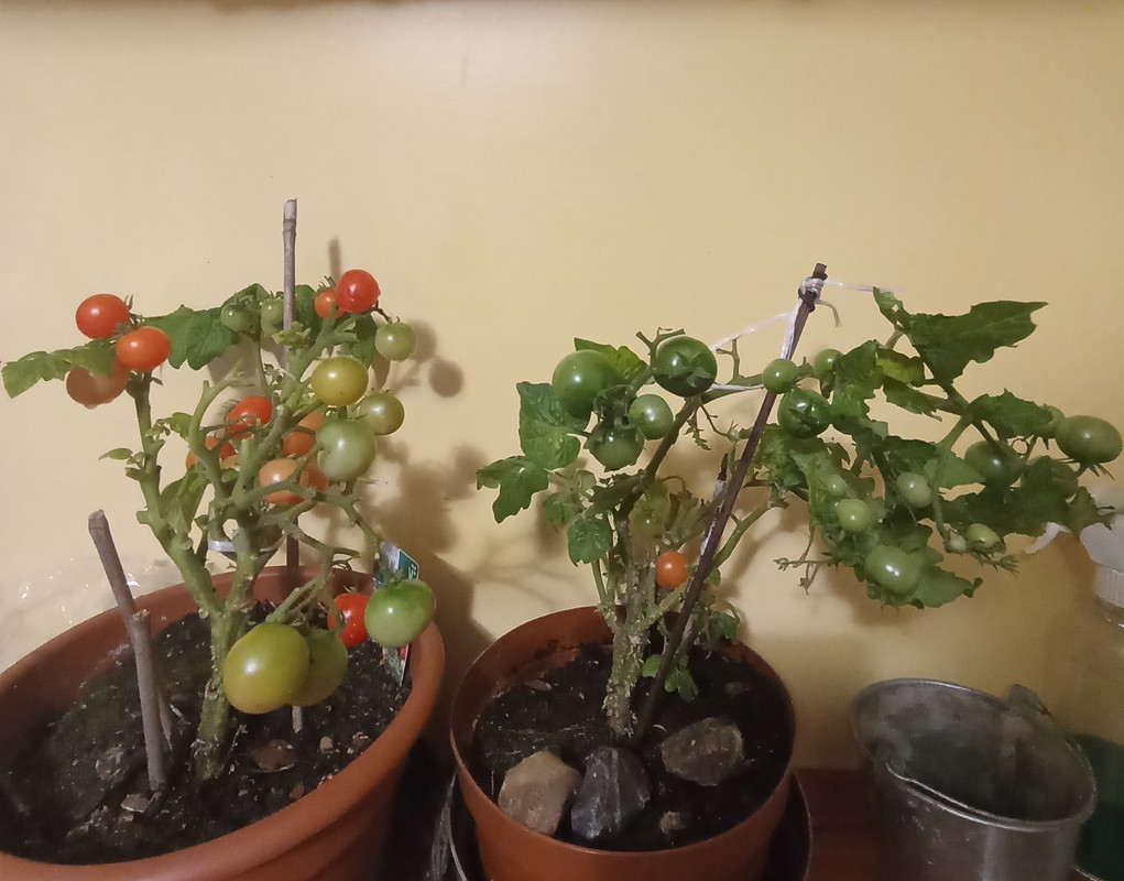Dzisiaj pozrywałem wszystkie zielone pomidorki oprócz koktajlowych, bo nie ma sensu ich trzymać. Krzaki już co niektóre martwe więc i co niektóre zielone pomidory spadają całymi kiściami i mają spęknięcia. Pomidorki będą przechowywane w chłodniejszym pomieszczeniu do +15 stopni.