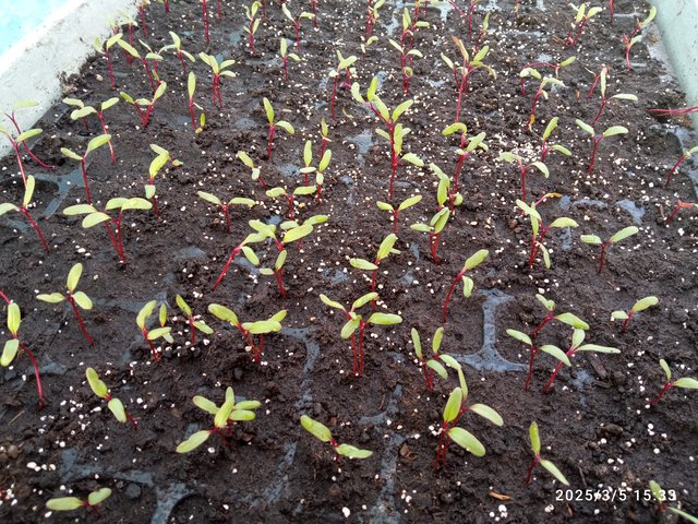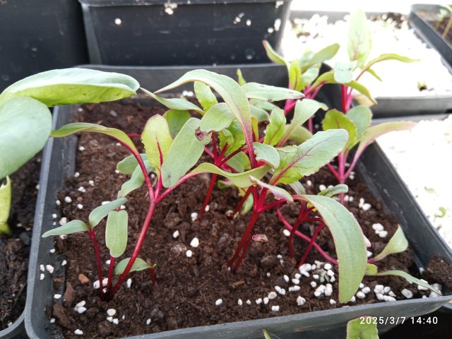 Kłębki buraków w wilgotnym perlicie ciągle jeszcze kiełkują ale na moje tunelowe potrzeby mam już wystarczającą ilość sadzonek. Jednak w doniczkach buraczki rosną szybciej niż w VEFI 160.
