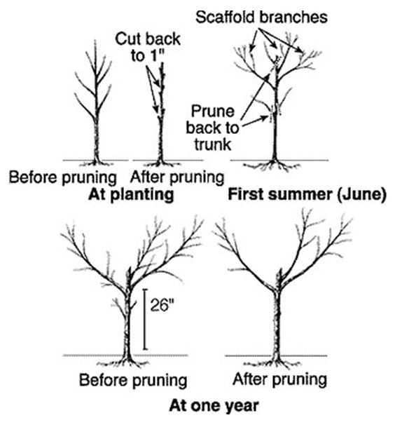 Następnego roku wiosną uzyskane konary skraca się na długości 30-40 cm (silne drzewa dłużej) nad pąkiem skierowanym na zewnątrz. Wszystkie konary równo na tej samej wysokości. Skrócony konar powinien dać dwa pędy. Pędy te powinny być szeroko rozłożone od konara. Uzyskujemy 6 pedów (albo 8).