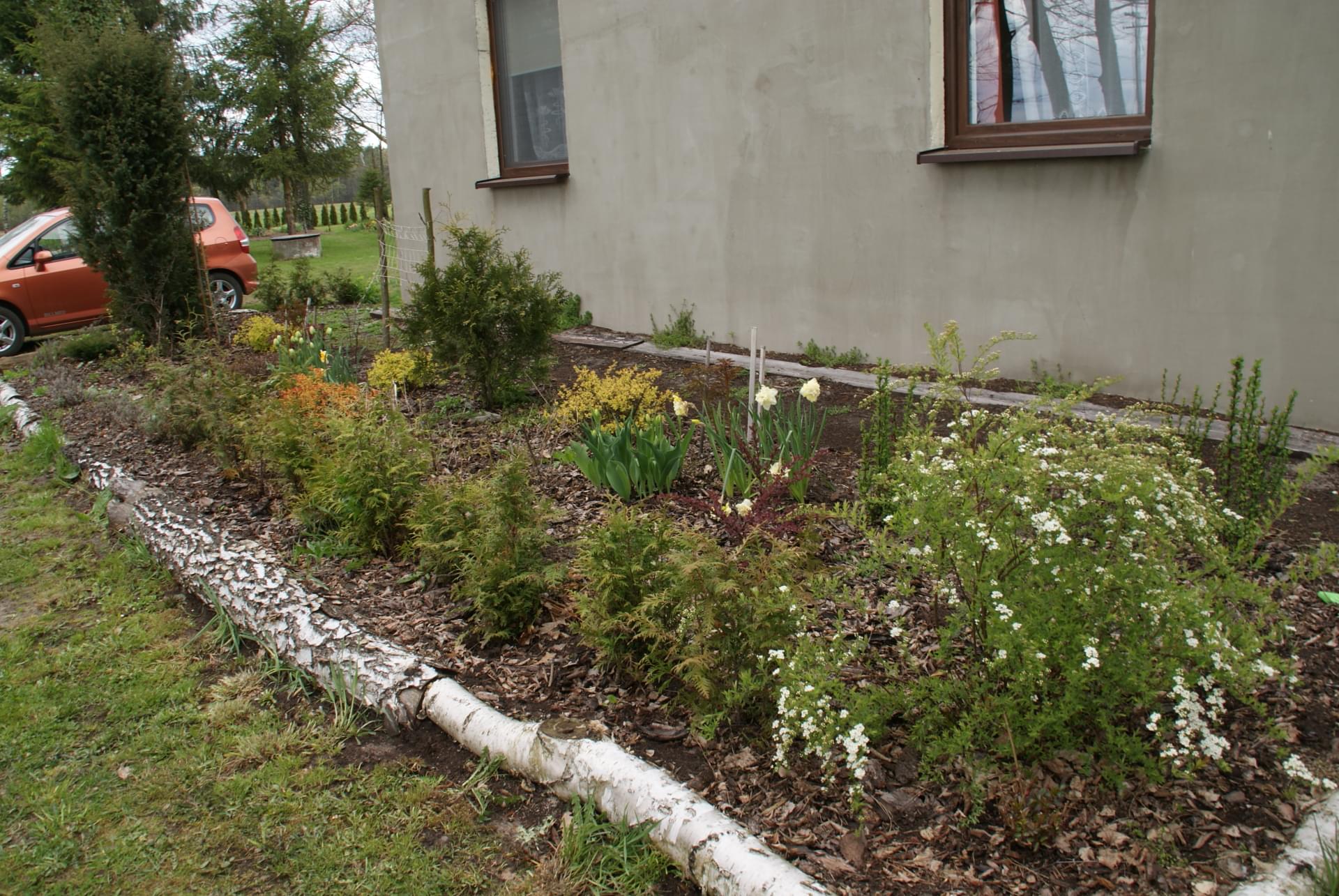 Rabatka przy domu ciekawie skomponowana...czy te krzewy są niskie