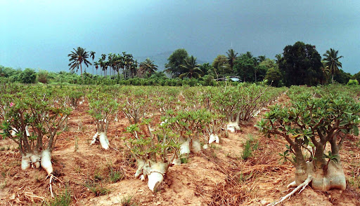 Sadzone adenium w Tajlandii w gruncie wyglądają jak buraki.