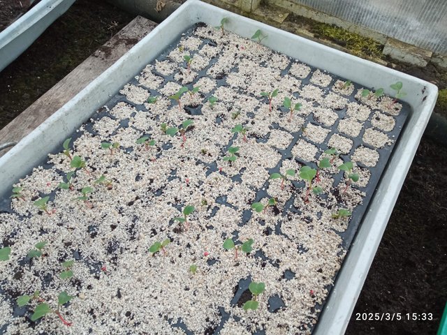 Jednak opłaca się podkiełkować nasiona. Wyłożona na wacik 26 II, wysiana punktowo 28II wczoraj zaczęła kiełkować. Ciekawe czy przegoni tę sianą (bez podkiełkowania) 1 II. Z rozsadą też szału nie ma. Wolno rośnie.